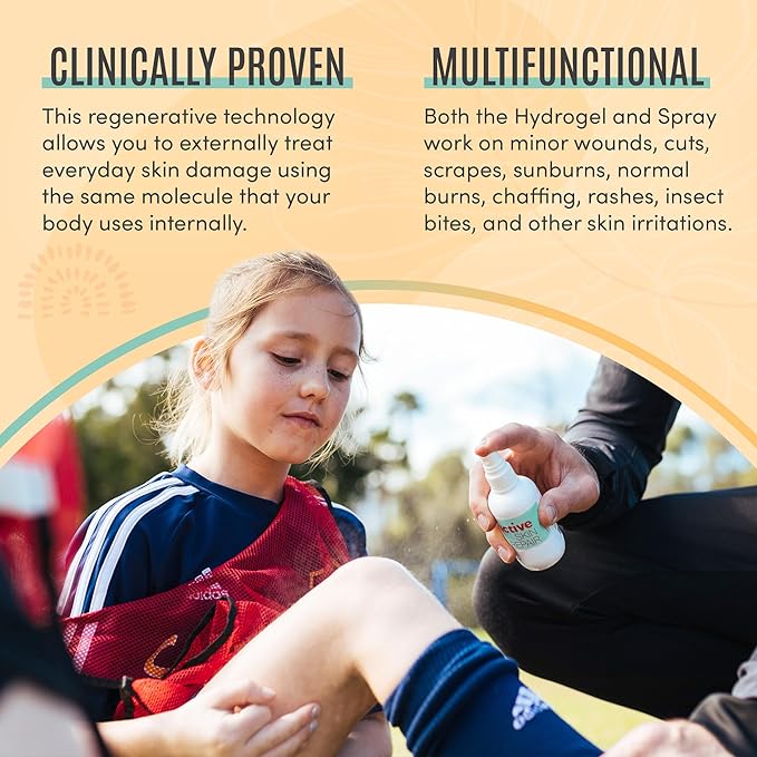 - FIRST AID HYPOCHLORUS SPRAY AND GEL: The technology used in Active Skin Repair is the same safe and gentle molecule used in hospitals & households worldwide; Hypochlorus Acid cleanse wounds to help skin recover faster