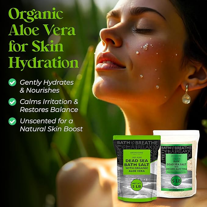 Aromasong 5 lbs Raw Dead Sea Salt with Organic Aloe Vera, not Cleaned, Still Contains All Dead sea Minerals Including Dead sea Mud, Fine Medium Grain Large resealable Bulk Pack (Packaging May Vary)
