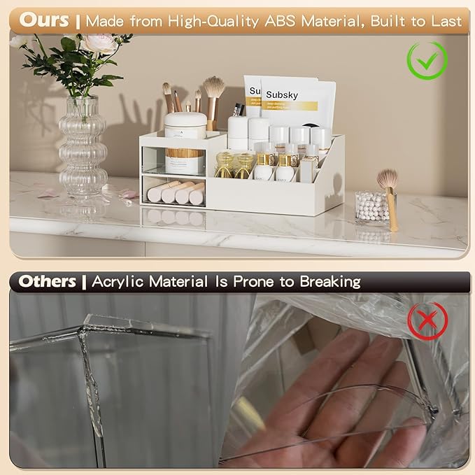 - 【Durable Materials】Elevate your space with our sleek makeup organizer, crafted from high-quality ABS plastic for a sophisticated look. Its smooth surface and minimalist white design make it a perfect makeup and skincare organizer for any makeup organizers and storage needs.