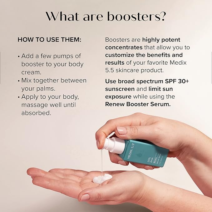 - BOOSTER – Supercharge your regular skin care routine by adding this highly effective + concentrated 20% AHA Exfoliating Glycolic Acid Renew Booster Serum formulated to be combined with your favorite Medix 5.5 body moisturizer treatment cream, but can also be added to your favorite body moisturizer, body oil, facial serum, face moisturizer, etc.