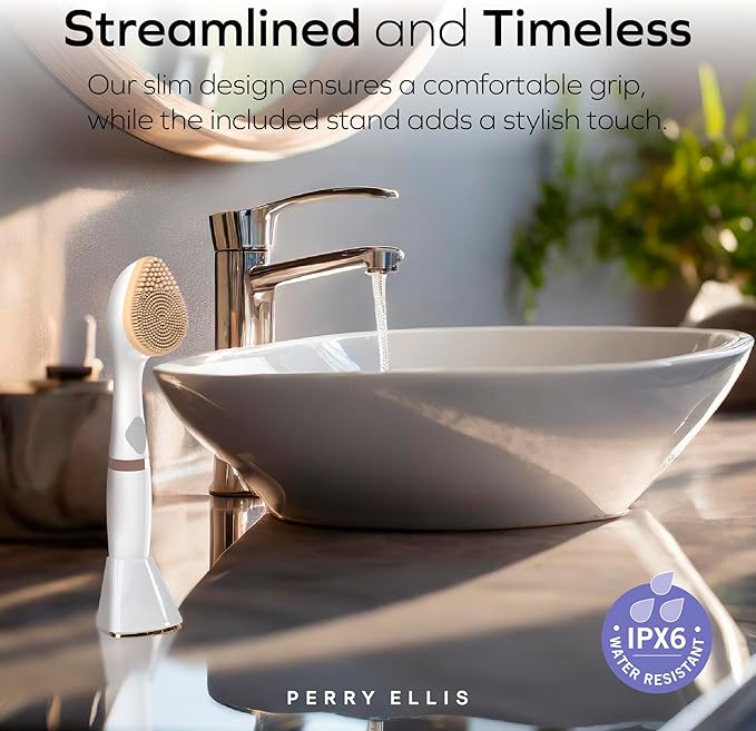 Perry Ellis 3-in-1 Beauty Brush with Silicone Face Cleanser, Makeup Applicator, and Metallic Eye-Massaging Plate, IPX6 Water-Resistant Electric Skincare Accessory with 3 Vibrating Modes and Stand