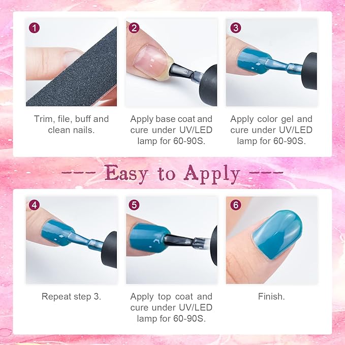 - Healthy and Durable: Gel nail polish formulations are developed by professionals and made from natural resins, healthy minerals and other ingredients. With the nail lamp curing, gel nail polish can stay on nails for about 21 days with almost no color difference. You can use our products with confidence.