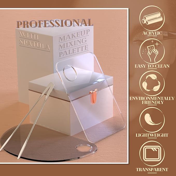 - 1【4 in 2 Set】2 sets of makeup mixing palette contains 2 acrylic makeup palette for foundation (6 * 4 inches) and 2 stainless steel makeup spatula (6 inches), individually packaged, super durable.