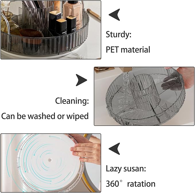 - mooth Rotation: 360 degree rotation makes it easier to find what you need and brings you a convenient using experience. Tray edges are 1.96'' high to ensure that cosmetics do not fall out when