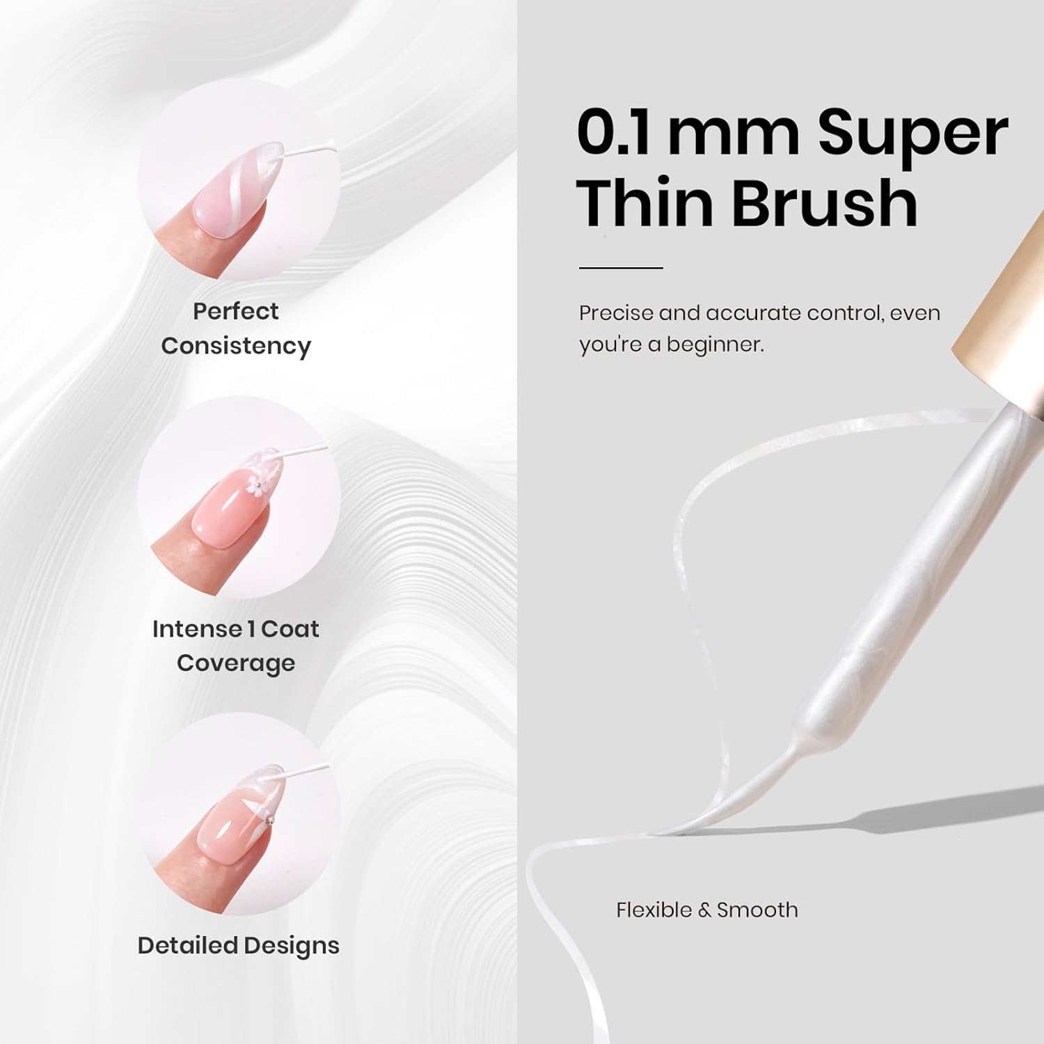 - 【Create Smooth Lines】The brush is soft and slender, with good resilience, and can be used in nail art design for drawing lines, filling, outlining, waves, lines, french, painting and so on. And the special bottle mouth design can scrape off excess pearl white liner gel nail polish on the brush, effectively reducing the dripping of pearl gel liner polish and providing a better operating experience.