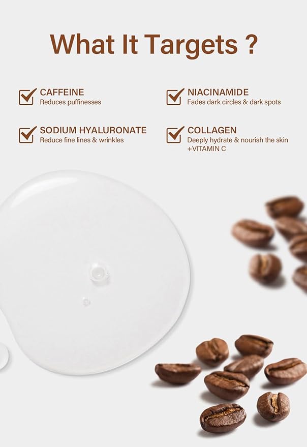 - What Caffeine Eye Cream Does: this eye serum improves problematic skin, wrinkles, fine lines, dull skin, uneven tone, and dry skin to address the dark spots, and dark circles under the eye which can help to restore your skin look younger and healthier.