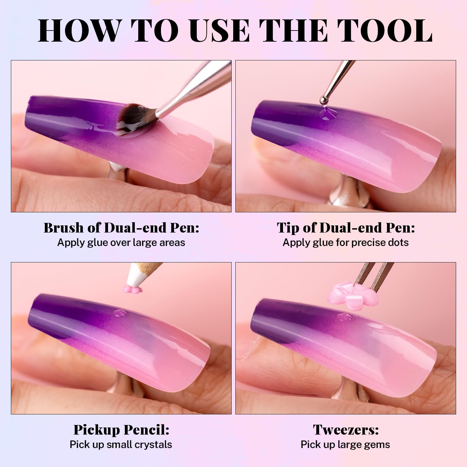 - đź’ŽRHINESTONE DOTTING PICKER TOOLS: The wide-head brush end of the dual-end dotting tool makes it easy to apply a large amount of glue to the nail surface at once, while the other mini dotting end is great for detailed drawing, so you can pick up a blob of glue and draw the pattern you want on your nails. Picker pencil can help you handily pick up small flowers and metal beads, while tweezer is a better choice for big flowers and beads.