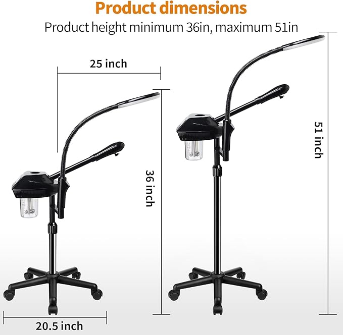 - ⭐【Adjustable Height】–The height of this professional facial steamer can be adjusted from 36 inches to 51 inches, with a 360-degree rotating main frame and a 360-degree rotating nozzle, which is very suitable for spa or home personal care.