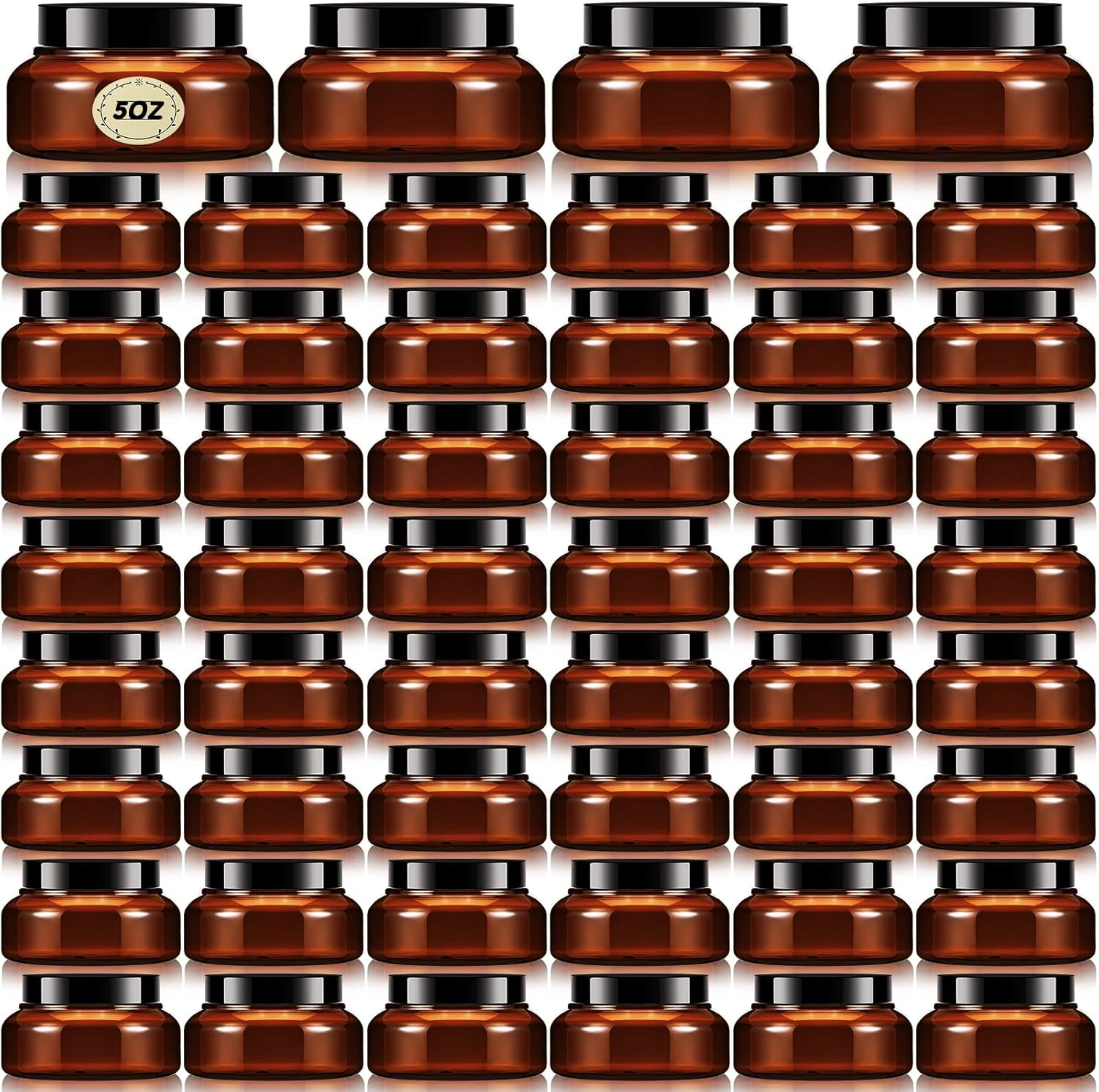 Tessco 48 Pcs Plastic Jars with Lids and Labels Body Scrub Jars Round Refillable Cosmetic Containers Empty Butter Travel Containers for Sugar Scrub Lotions Cosmetics Cream(5 oz,Brown)