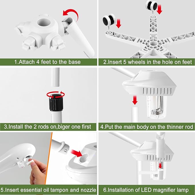 - 【Removable Standing Facial Steamer】The height of this standing facial steamer can be adjusted from 36-52 inches, the nozzle can be rotated 360°, removable 650ml water cup, convenient water spout, mobile facial steamer with wheels allows you to lie down or sit down to enjoy the spa aromatherapy.