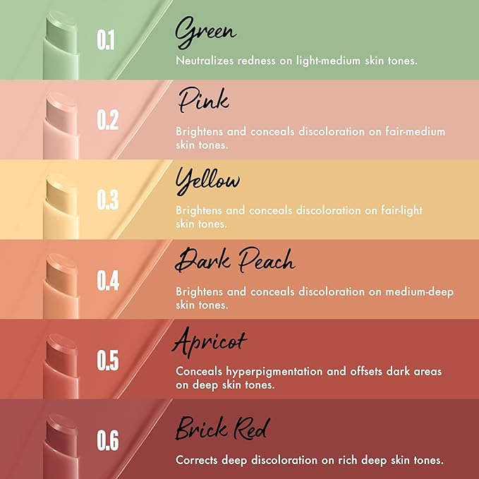 - Color Correcting Made Easy: Our 6 color correcting concealer shades for all skin tones and 18 complexion concealer stick shades help conceal & brighten like a pro. Fix dullness, redness, blemishes, dark spots, undereye circles, and discoloration