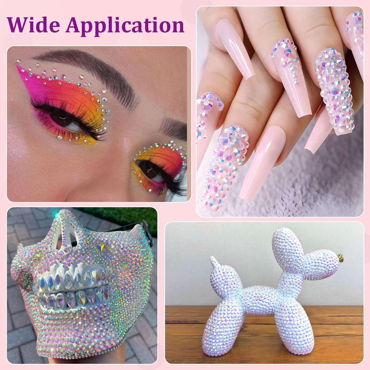 - đź’ŽWIDE APPLICATION -- These sparkling iridescent resin rhinestones are perfect for creating dazzling looks. Use them for bedazzling DIY crafts like shoes, tumblers, mugs, bottles, phone cases, popsockets, scrapbooks, photo frames, diamond paintings, greeting cards, bags, glasses, guitars, keychains, hats, masks, hair clips, bracelets, wristbands, clothing, clothes, wedding dresses, and more. Apply it to what you want to bling!