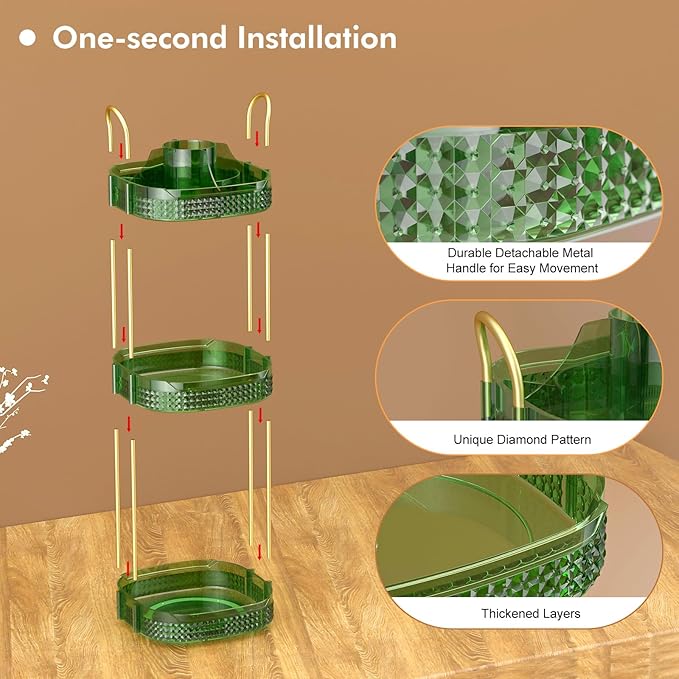 Awenia Rotating Makeup Organizer 360, Stackable Adjustable Large Capacity Cosmetic Storage Unit,Dresser Bathroom Kitchen Countertop Organizer with Metal Handle, Plus Size (Gem Green, 3 Tier)