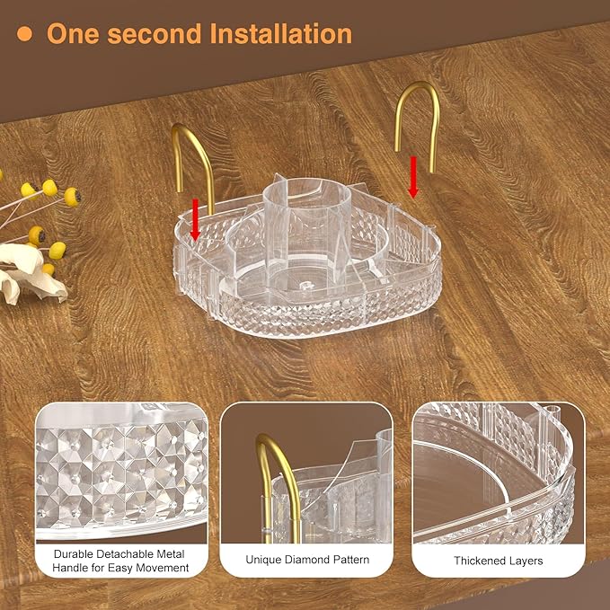 - 360 Degree Rotation& Easy to Install:➤Reinforced steady base rotates smoothly and silently, the rotating makeup organizer is easy access to all of your make-up in seconds.Less installation step are required other than inserting metal rack and handle,do not worry about repeated disassembly to shorten the lifetime of the makeup organizer.