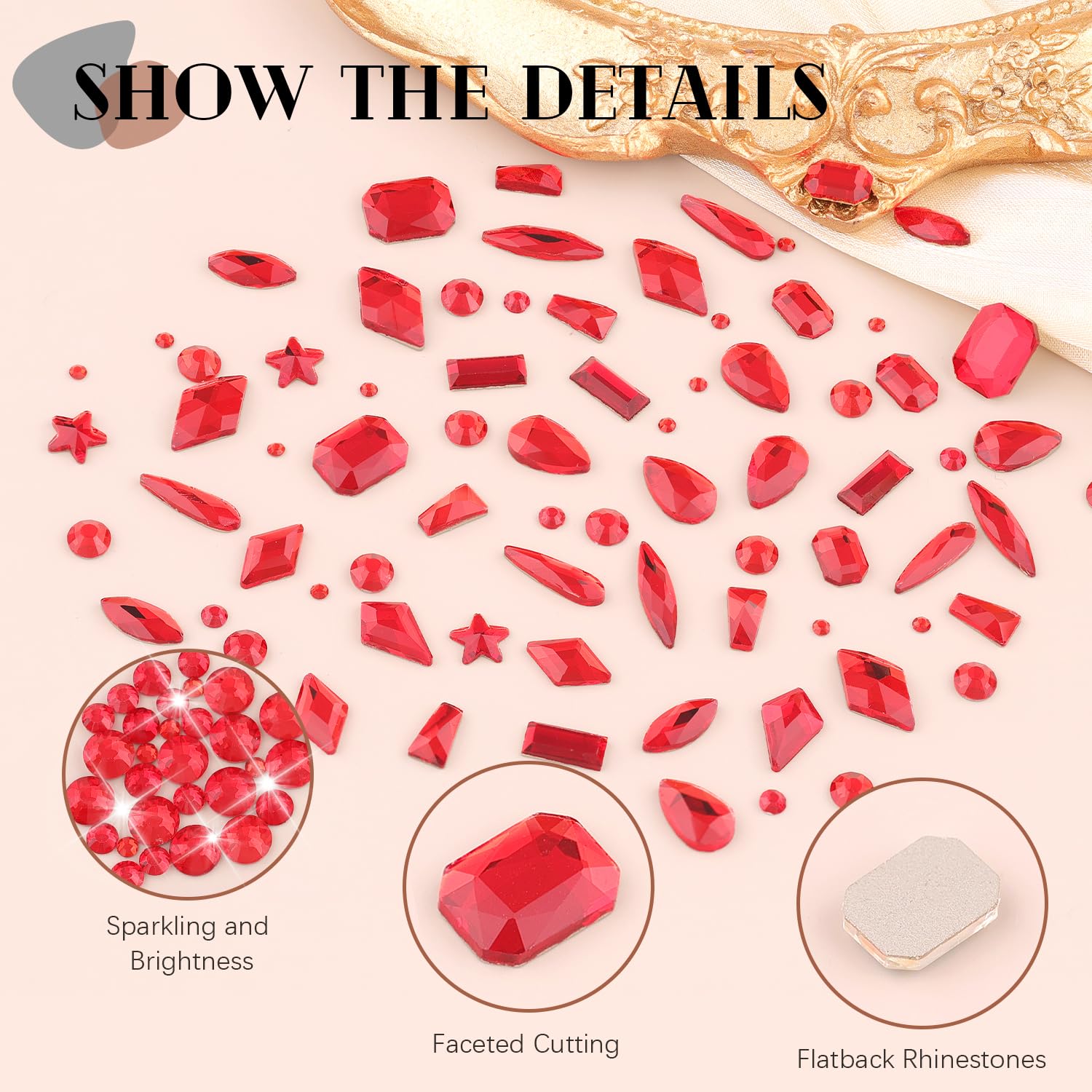 - đź’ŽPACKAGE CONTENT -- The package contains 120Pcs multi shapes flatback gems crystal and 3100Pcs 1.5-4mm round beads, totally 3220Pcs Red rhinestones. Additionally, 1 tweezers for large size gems and 1 pickup pen for small size gems. 1 15ml rhinestones glue gel for nail design. This rhinestones kit makes it easy for you to make any nail art you like, and will bedazzle your acrylic nails!