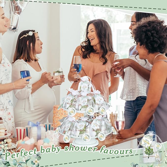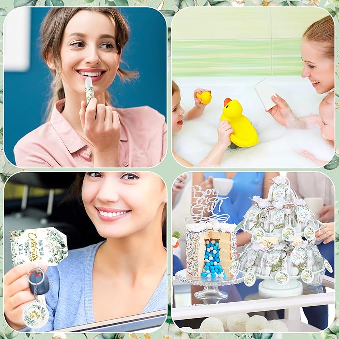 - Complete, Delightful Baby Shower Favors: this set of baby shower favors is a thoughtfully curated selection of 60 lip balms, 60 eucalyptus leaf soaps, 60 fake eucalyptus leaves, 60 charming keychains, 60 white organza bags and 60 thank you tags; These baby shower favor gifts, bulk packaged, are an ideal way to greet, commemorate, and thank your precious guests
