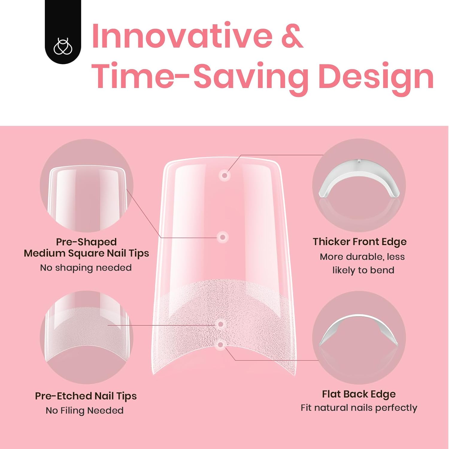 - Easy Application with 10ml Nail Glue: Medium square nail tips come with a 10ml bottle of fast-drying nail glue, ensuring hassle-free and secure application for beginners and professionals alike. These half-cover, nail tips are great for creating trendy, custom nail designs like French tips, ombré effects, or intricate nail art.