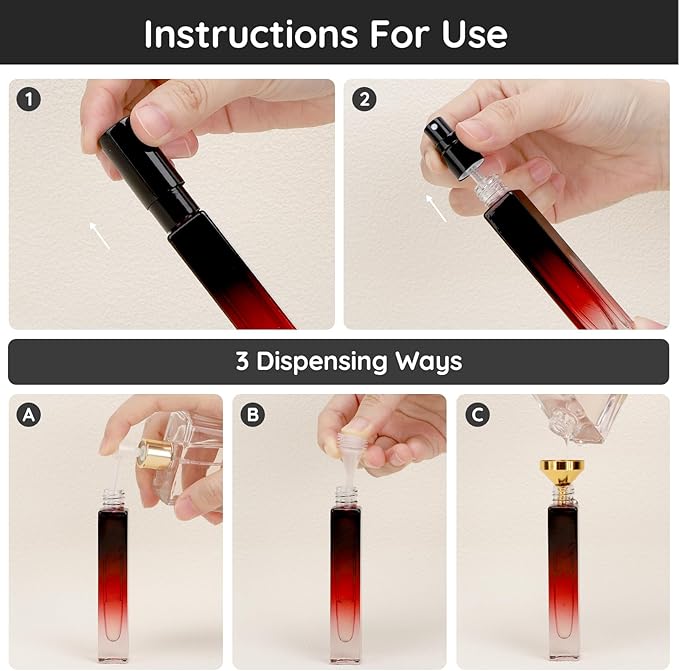 - 【Portable for Carrying】Set of 5 glass perfume bottles, each 10ML, measured 4.7x0.67in/12x1.7cm. Lightweight and portable, it is easy and convenient to store and carry out. Ideal for placing in your handbag or pocket, you could use it anytime, anywhere.