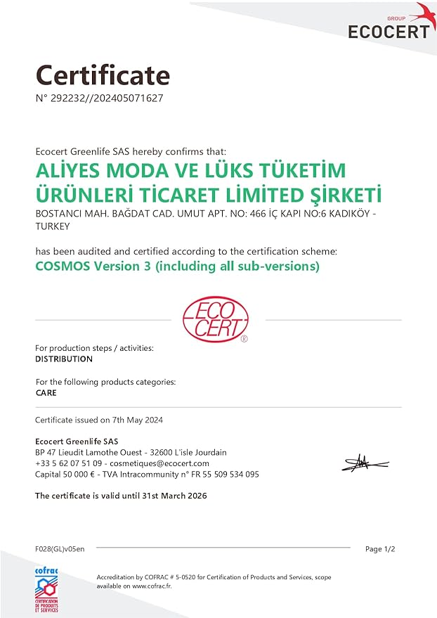 - Certified by Ecocert Cosmos Natural – 100% Natural Formula Made with 100% natural and mostly organic ingredients, certified by Ecocert Cosmos Natural. Free from parabens, silicones, alcohol, and artificial fragrances – a clean beauty essential for all skin types.