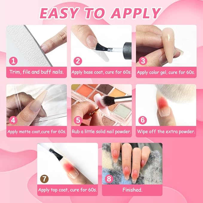 - 【Easy To Use】To get the best nail effect,need to apply base coat and no wipe top coat, cured via a UV LED lamp, before applying the powder. Rub with a sponge stick or a ombre nail brush will be easier to get amazing effect.