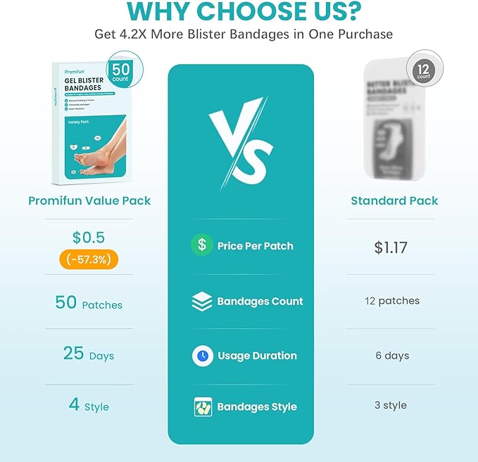 - 【Gentle Adhesive & No Residue】Designed for comfort, our bandages stay put without irritating your skin. Promifun blister pads can be applied to various body parts like feet, toes, heels, soles, and fingers. The gentle adhesive allows for easy removal without leaving residue, perfect for sensitive skin.