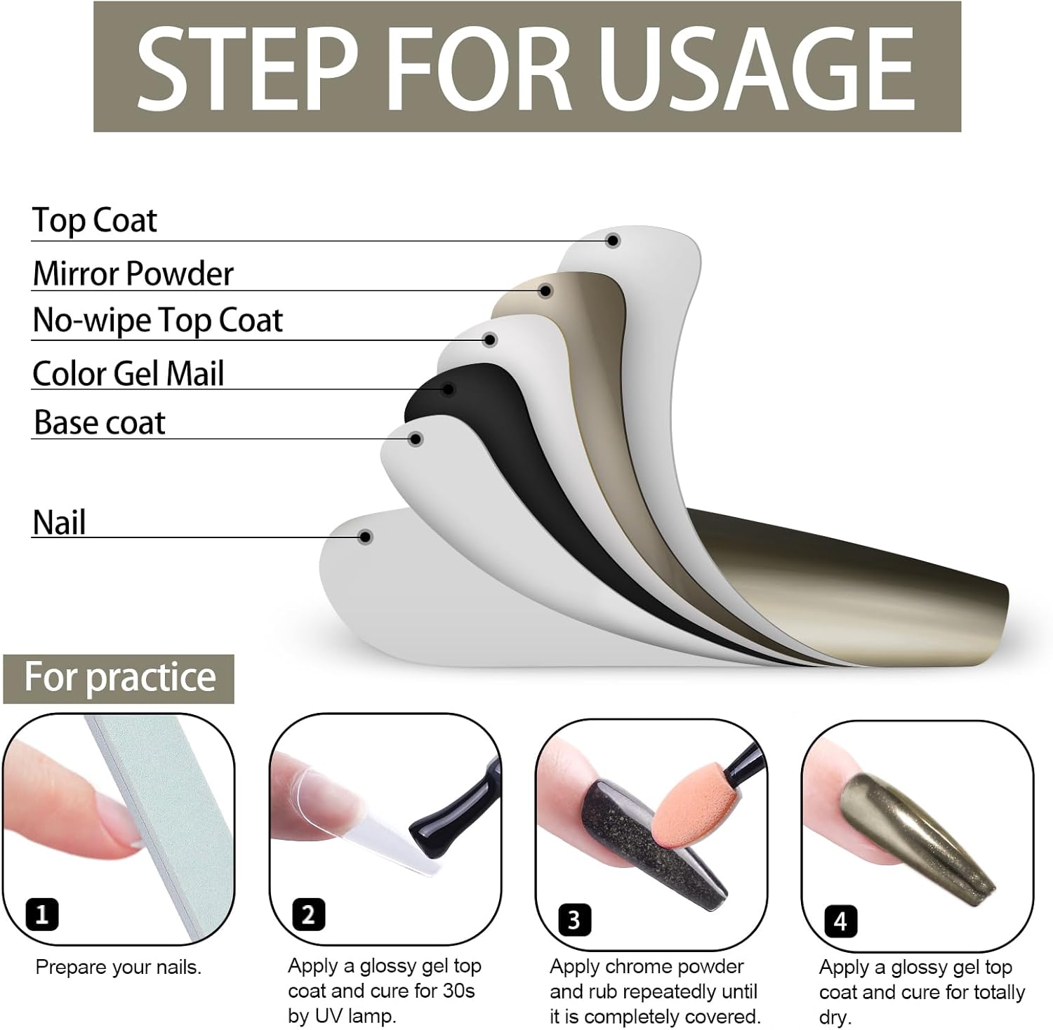 - PACKAGE CONTENTS:1 PCS chrome nail mirror pigment powders. It needs to be used with gel nail polish and no wipe top coat. They can make many different design for your gel nail polish. It gives different color base a pearly shine for your nails