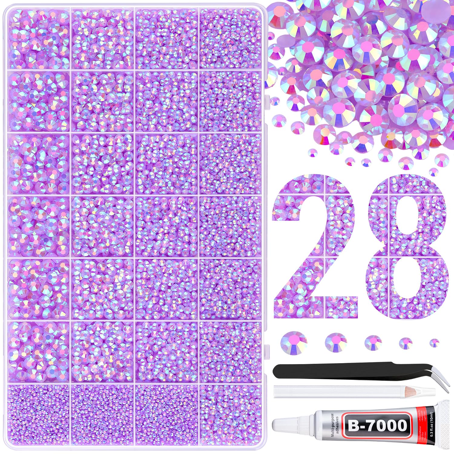 - PACKAGE CONTENT -- Include 1 box with 28 grids, featuring a variety of sizes, approx. 30000 pcs bling-out resin rhinestones. 1 tweezers and 1 pickup pen are included for easily picking up gems. 1 B7000 adhesive jewels glue for jewelry making