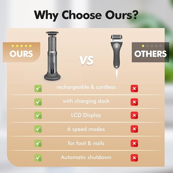 - 2 in 1 cordless electric foot filer and nail grinder: The electric callus remover heavy duty can be used for feet and nails. the electric filer comes with 10pcs flint paper and 10pcs fine sandpaper for feet, 10pcs flint nail sand circle and 10pcs fine sand circle for nails.
