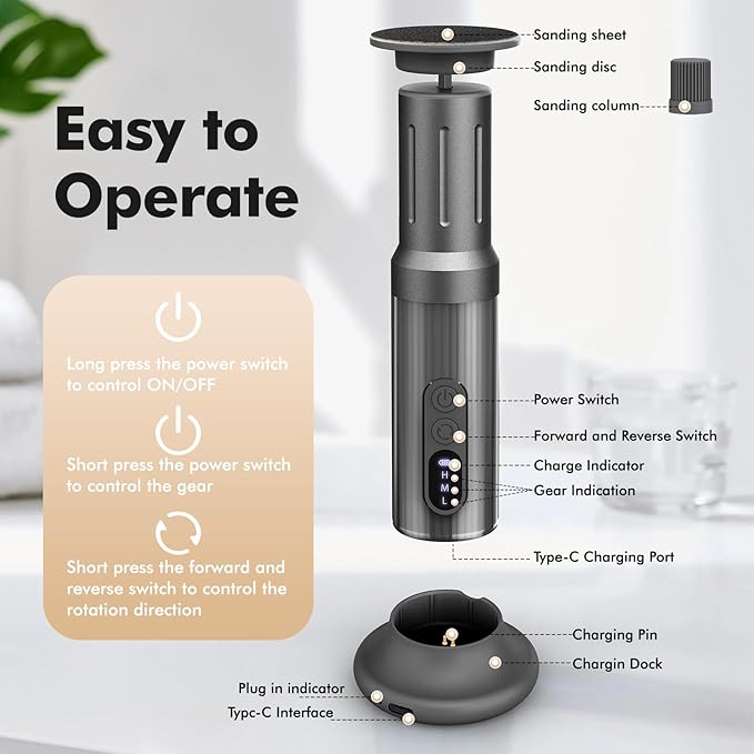 - Easy to operate: There are just two buttons on the electric foot callus remover, long press the power button to control ON/OFF, short press the power button to control the speed, short press the direction button to control the rotation direction. This is a simple and convenient pedicure tools for feet.