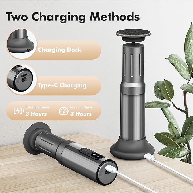 - Dual charging mode: The foot file electric has LCD icon to indicate battery level, you can charge directly using the Type-C charging port on the electric foot filer, or place the foot grinder on the charging dock(charging pin connect) for charging.