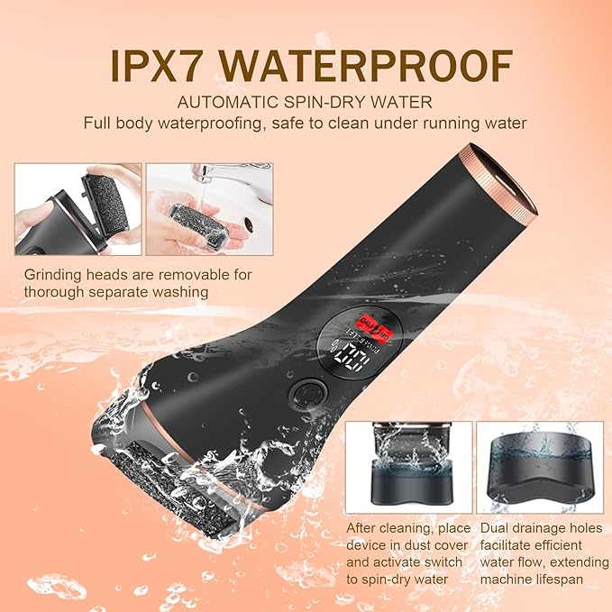 - IPX7 WATERPROOF & AUTOMATIC SPIN-DRY: This foot grinder has IPX7 advanced waterproof rating, fully waterproof for dry/wet use, can be rinsed under tap water. After cleaning, place into dust cover and press starter switch to activate automatic spin-dry, easy to use. The dust cover has 2 drainage holes for easy water flow, extending product lifespan